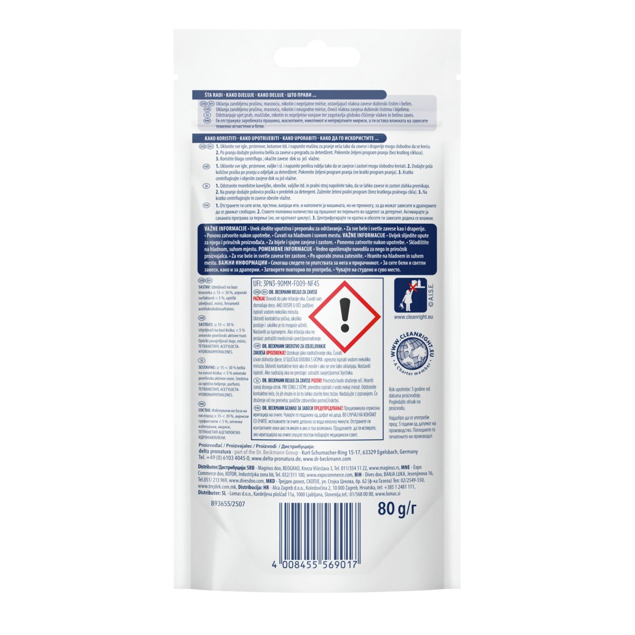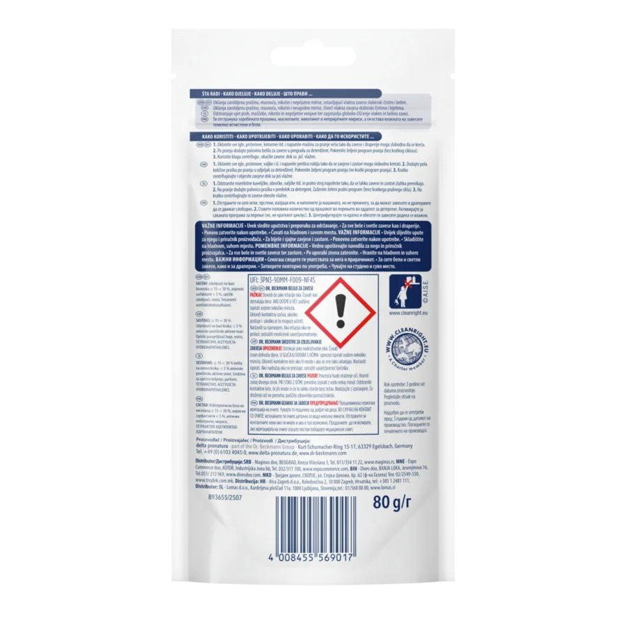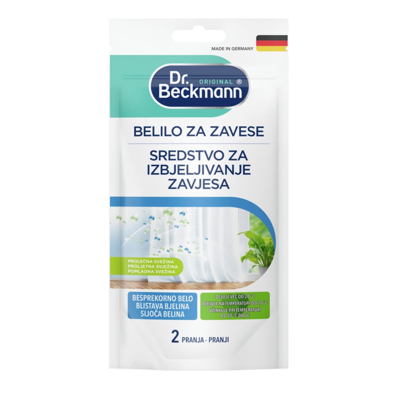 Dr. Beckmann Belilo za zavese pouzdano uklanja upornu prašinu, masnoću, nečistoće od nikotina i neprijatne mirise. Ostavlja vlakno vaše zavese dubinski čistim i belim sa svežim mirisom za divan osećaj čistog vazduha. Radi čak i od 20 °C što čuva energiju.Kako da ga koristite