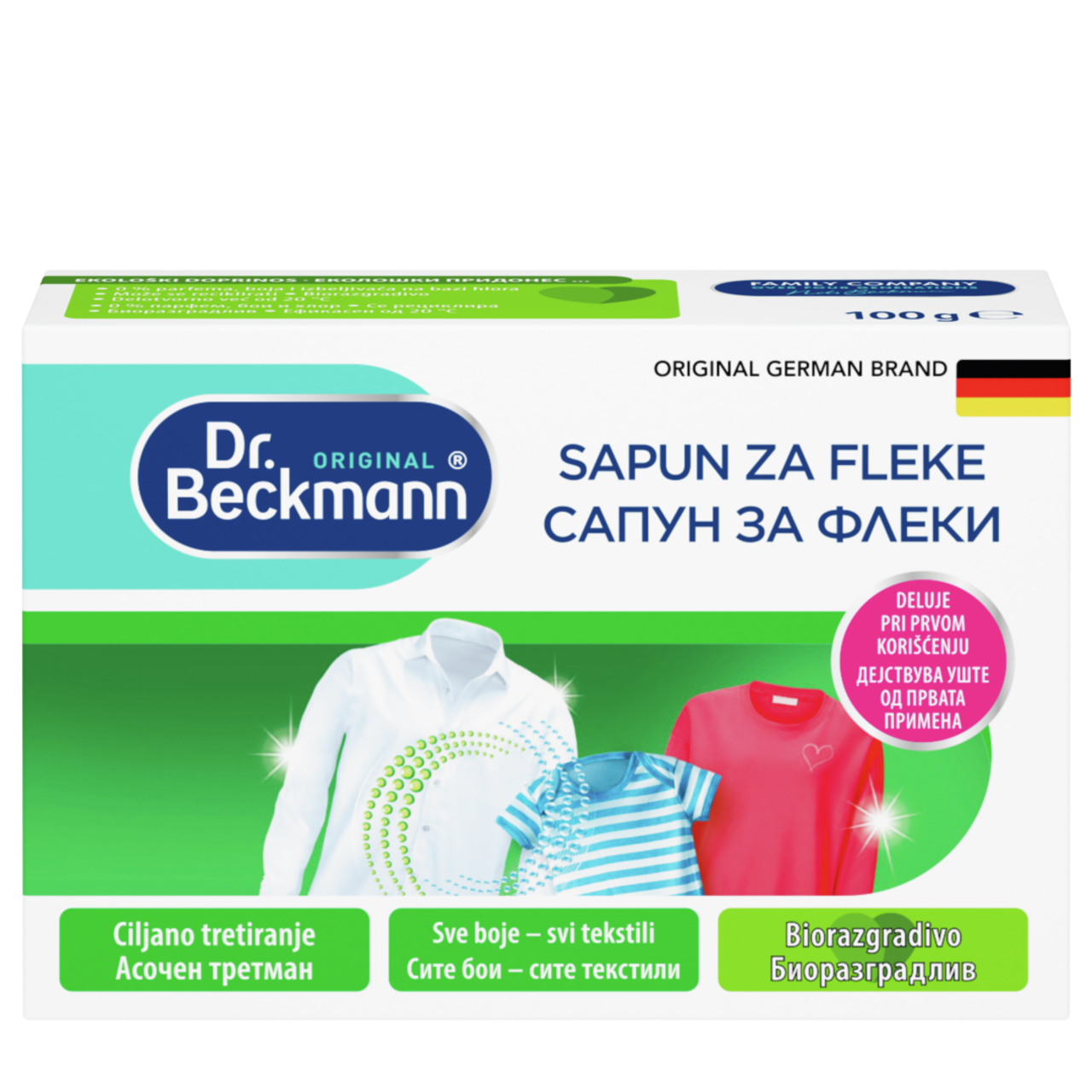 Dr. Beckmann Sapun za fleke uklanja mnoge, čak i uporne fleke sa perivih i neperivih tkanina, tapacirunga i tepiha zahvaljujući visokoefikasnoj formuli za uklanjanje fleka. Nanesite Dr. Beckmann sapun za fleke direktno na fleku. Za veće fleke, koristite rebrastu strukturu za pranje na dnu sapuna, a za precizno uklanjanje fleka koristite oštre vrhove sapuna. Uklanja mnoge fleke poput fleka od ulja za kuvanje/salate, šminke, karmina, krvi, prljavštinu na kragnama i manžetnama, masnoću i mnoge druge.Idealno za