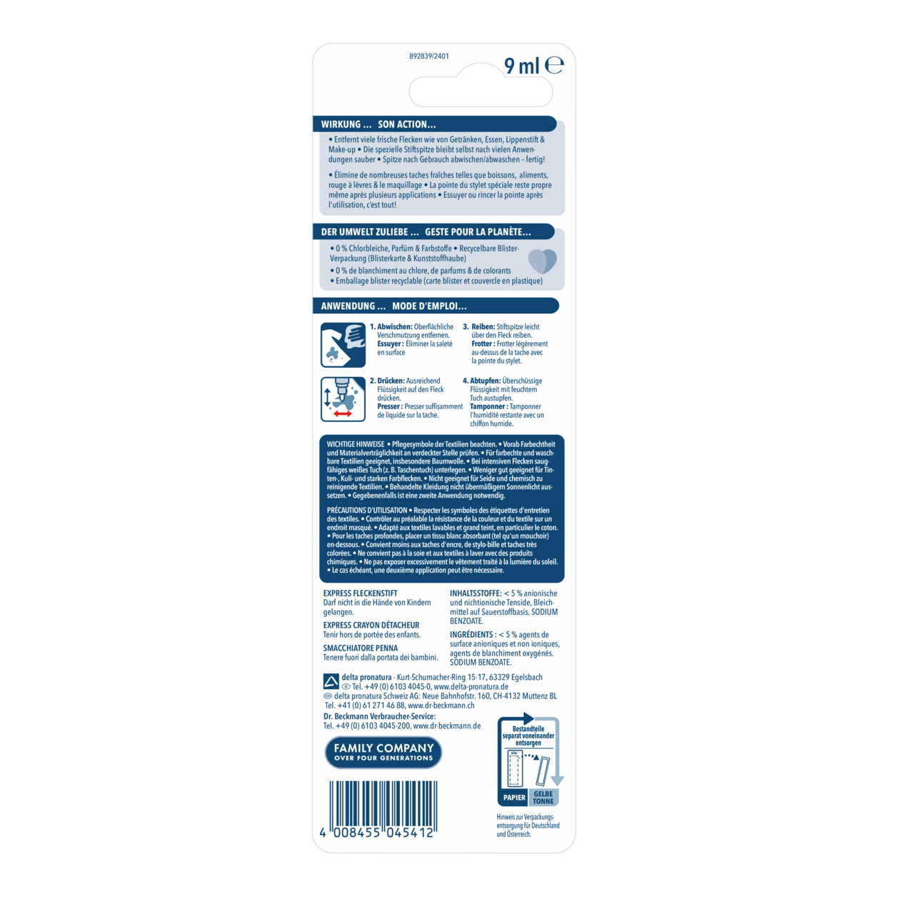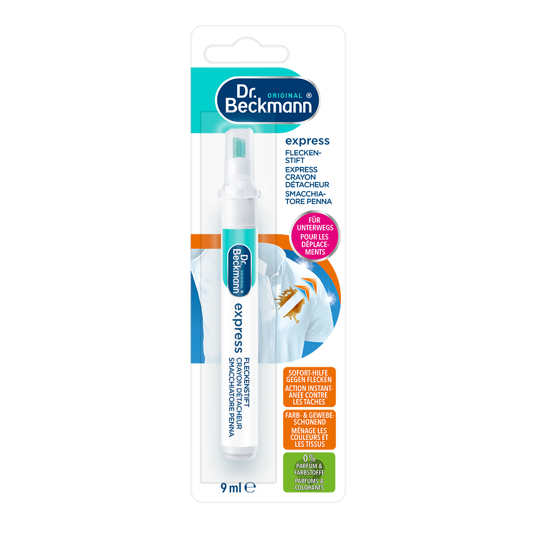 Dr. Beckmann Expres olovka može biti jednostavno rešenje za sve fleke koje se mogu pojaviti u hodu. Sveže fleke mogu se lako skinuti kombinacijom surfaktanta i aktivnog kiseonika. Vrh olovke za čišćenje omogućava ciljano tretiranje fleke, a nakon što se ispere može se ponovo upotrebiti za sledeću fleku bez ostavljanja ostataka.