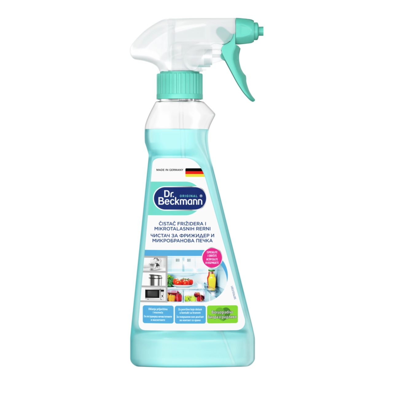 Gde god se hrana skladišti ili priprema, higijenska čistoća je ključna. Redovno čišćenje frižidera, mikrotalasnih, radnih površina itd. jako je važno. Dr. Beckmann Čistač frižidera i mikrotalasnih rerni s organskim alkoholom brzo daje higijensku i detaljnu čistoću u i oko frižidera, a uz to odstranjuje masnoću sodom i drugim sredstvima. Sada s novim boljim mirisom. Uz formulu bez ispiranja nema nikakvih ostataka, što je čini sigurnom za upotrebu na svakoj površini. Jednostavno poprskajte, obrišite i očistite za blistavo čistu kuhinju svaki put.