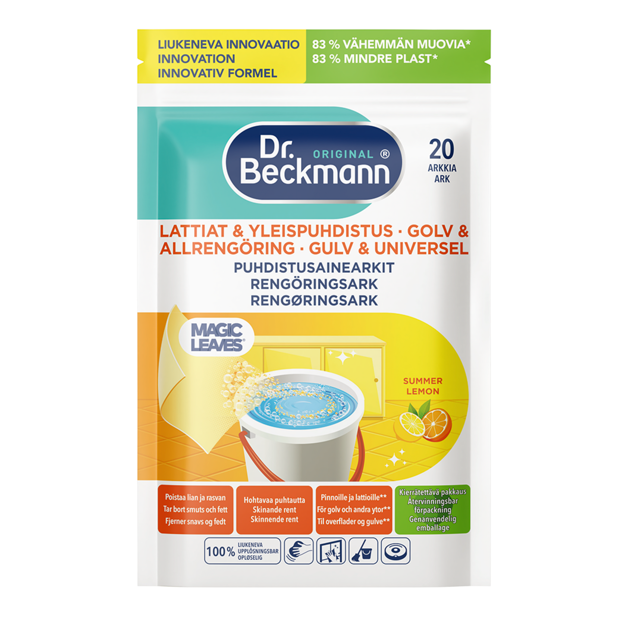 Dr. Beckmann Golv & Allrengöring Rengöringsark revolutionerar rengöring i hemmet: De ultralätta dukarna är 100 % upplösbara och är kraftfulla mot smuts och fett. Detta är lätt gjort: Bara släpp ner och moppa! Bukarna är lämpliga för alla vanliga ytor och golv** och lämnar en frisk doft av sommarcitron. Tack vare den kompakta storleken är Golv & Allrengöring Rengöringsark lätta att bära med sig, förvara och de använder 83 % mindre plast* i förpackningen. Upptäck våra nya Golv & Allrengöring Rengöringsark för ett skinande rent hem!
