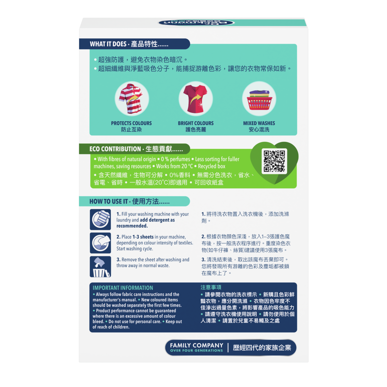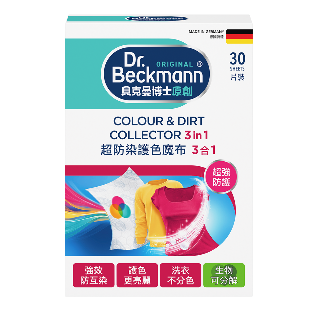 貝克曼博士「超防染護色魔布」,創新的鎖色技術,為您的衣物提供有效保護,防止衣物染色。魔布表面具有超細纖維與淨藍吸色分子,能捕捉游離色彩,讓您的衣物常保如新。